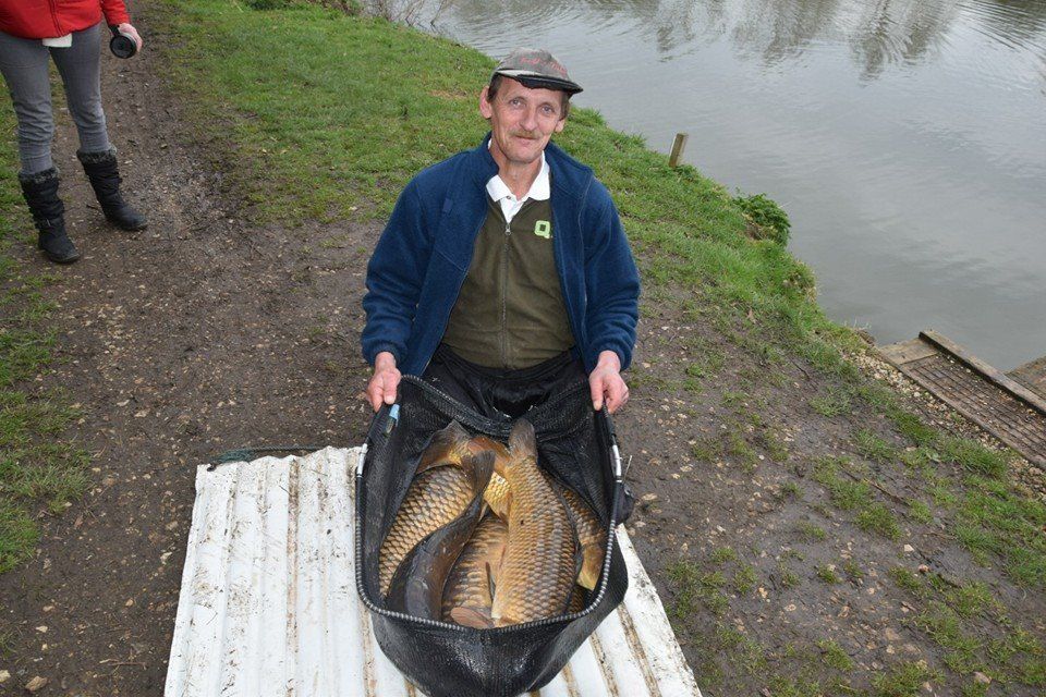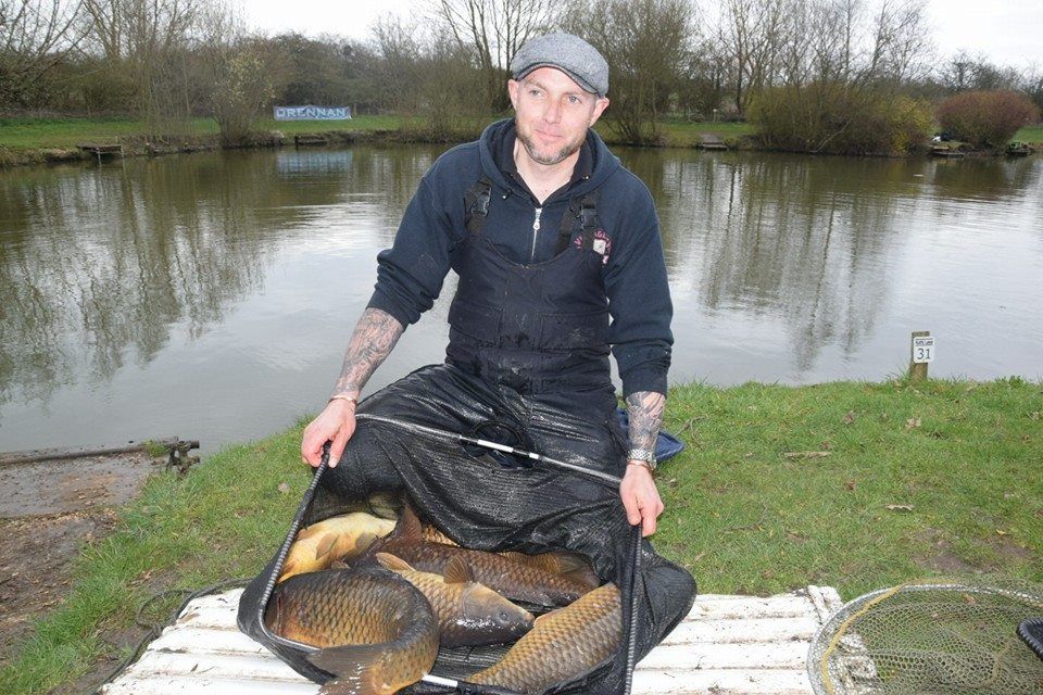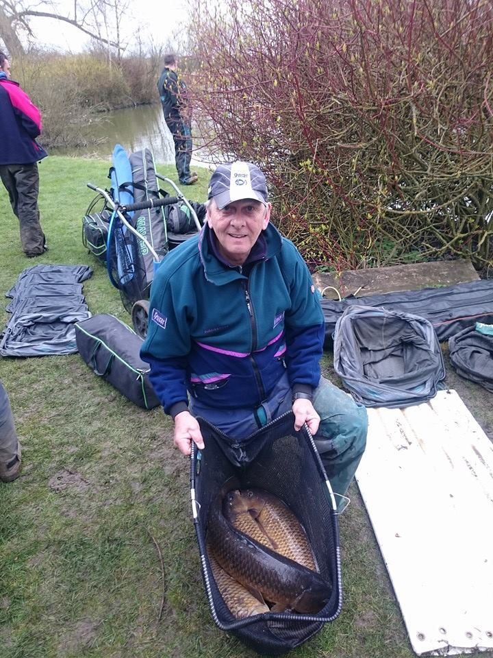Finally in B section there was that important question whether Steve could win his section from car park bank peg 28 . The leader in the first part of the match was Mark Sawyer who had caught a couple of quick carp to take control of the section but as the match wore on Mick Lane put himself in pole position with two big fish for nearly 30lb leaving Steve at best in 4th place but a switch to his 2 plus 2 short line pulled him back in the game as he caught 4 smaller carp late in the match and the weigh in was going to be close. Steve was first up and he put 36lb on the scales and when Mick Lane put his two carp for 29lb it was all going to come down to silvers who was going to be champion. Micks silver net was raised from the water and after being placed in the weigh sling the scales settled on 3-14 leaving Steve the section winner and overall Rolfslake Easter Festival Champion 2015 and retaining the title he won in 2014 {very well done Steve}.